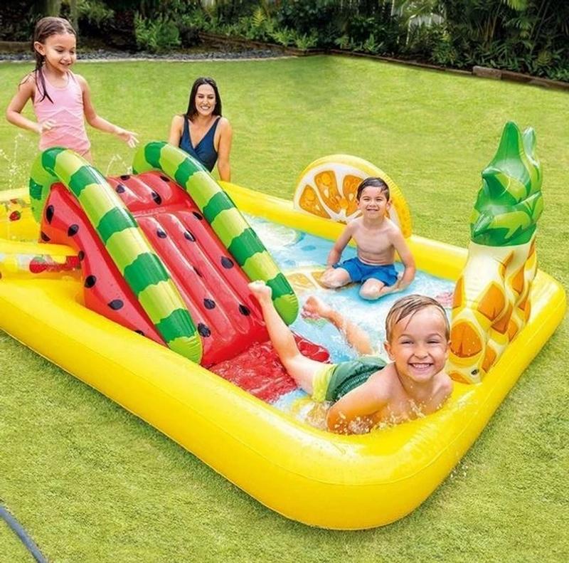 Игровой центр Intex 57158 Фрукты с горкой в коробке. 🔹 Игровой надувной центр Intex 57158 «FUN'N FRUITY» - феерия цвета, воды и фруктового настроения! Превратите свой двор в настоящий тропический остров развлечений! С ярким фруктовым дизайном, множеством игр и водными элементами, этот центр подарит вашему ребенку счастливое лето, полное приключений и радости. 🍍 2 бассейна и море впечатлений Комплекс включает большой и малый бассейны, соединенные красочной водной горкой с надувным посадочным ковриком. Малыши могут безопасно скользить вниз и снова снова возвращаться к игре! ✔️ Фруктовые украшения для настоящего праздника В комплекте: - яркие надувные ананас и апельсин - 6 цветных шариков для активных игр - безопасные бортики вокруг горки для защиты детей ✔️ Удобство и долговечность Бассейн изготовлен из прочного винила толщиной 0,30 мм. Встроенные сливные клапаны в обоих бассейнах обеспечивают простое обслуживание. Подходит для ручного, ножного или электрического насоса. 📏 Характеристики: - Размеры (Д×Ш×В): 244×191×91 см - Возраст: от 2 лет - Объем воды: 493 л (большой бассейн), 57 л (малый) - Высота бортов: 20 см (большой), 11 см (малый) - Максимальная нагрузка: 81 кг - Материал: высококачественный винил (0,30 мм) - Вес: 7 кг - Дно: ненадувное - Насос: не входит в комплект - Цвет: желтый, с яркими фруктовыми деталями - Упаковка: картонная коробка - Страна-производитель: Китай - Комплектация: горка, декорации, 6 шариков, ремкомплект 🎉 Intex 57158 «FUN'N FRUITY» - это не просто бассейн, а настоящий игровой мир где каждый день наполнен счастливыми моментами.