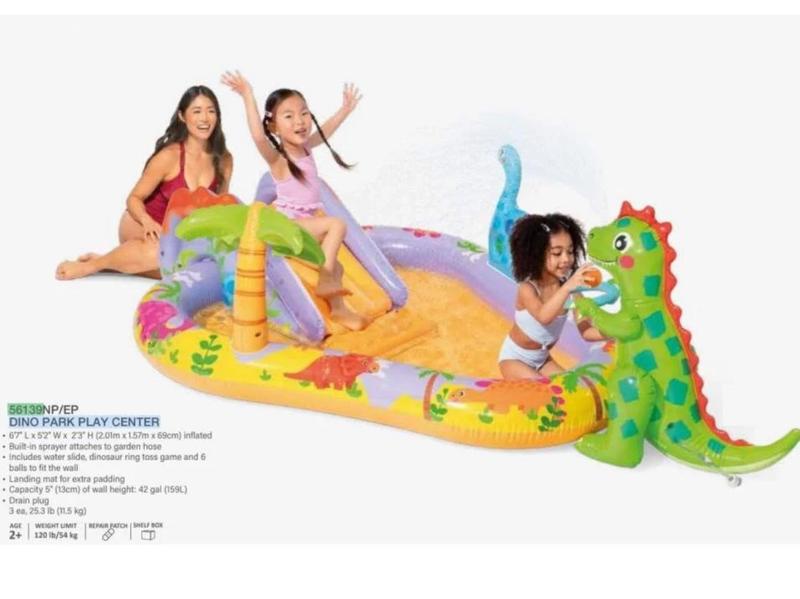 ІГРОВИЙ ЦЕНТР ДИНО ПАРК • 2,01 м x 1,57 м x 69 см у надутому стані.• Вбудований розпилювач кріпиться до садового шлангу • У комплекті водна гірка, гра з киданням м`ячів у кільце динозавра. • Килимок для м`якої посадки з гірки. • Висота стінки 13 см, об`єм води 159 л. • Зливна пробка МАКСИМАЛЬНА ДОПУСТИМА ВАГА 60 кг Матеріал : Виробник : -