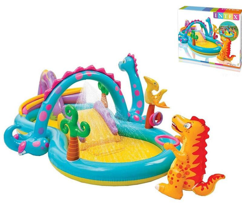 Intex Игровой центр 57135 NP (2) размер**********см, объемом 280л. Рады представить вашему вниманию суперклассный детский надувной центр NP "Планета динозавров" от всемирно известной торговой марки Intex! Планета динозавров - это целый аквапарк на вашем заднем дворе. Здесь водная горка, душ-фонтанчик, арка, бассейн и большой надувной динозавр с кольцом, с которым будет очень весело и интересно играть, бросая в него шарики. Игровой центр Intex предназначен специально для маленьких детей. Он не только спасет малышей от летней жары, но станет любимым местом для веселых игр в жаркие летние дни. Материал, из которого изготовлен наш игровой центр, представляет собой высококачественный винил, толщиной 0,35 мм, что делает надувную игрушку прочной и устойчивой к мелким проколам. Объем воды в бассейне составляет 280 л.