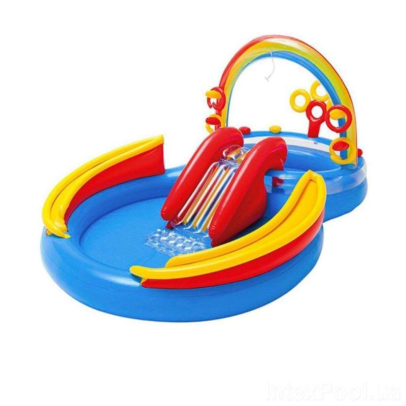 Игровой центр "Радуга" - это мини аквапарк, в котором производитель удачно объединил водный аттракцион с игровым комплексом. В комплект входит: водный центр "Радуга" с горкой; водный душ под аркой; набор для метания - надувные кольца; набор разноцветных пластиковых шариков. Выполнен из прочных и качественных материалов. Размер конструкции в собранном виде - 297х193х135 см., высота бортика бассейна - 30 см. Для детей от 2-х лет._ Бренд: Intex Упаковка: Коробка Цвет: Разноцвет Вес в упаковке: 7500 г Габариты в упаковке: 40.5 x 51 x 14 см Cтрана производитель: Китай Материал: Комбинированный Комплектация: Водный центр "Радуга" с горкой; водный душ под аркой; набор для метания - надувные кольца; набор разноцветных пластиковых шариков.