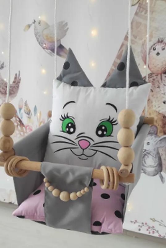 Подвесная качеля Котик Зефирка, качели для детей Если вы ищете красивую и небанальную игрушку для своего ребенка, то подвесная детская качеля - это то, что вам нужно. Она совсем отличается по дизайну от старых и привычных для нас уличных подвесных качель. Мастера постарались над дизайном и исполнением. Повесить такие качели вы сможете и в доме, и в квартире, ведь они выглядят очень стильно и современно. А в детскую комнату впишутся просто идеально. Конструкция разработана специально для маленьких детей, очень практичная и безопасная. Благодаря качественным крепежам, ребенок будет надежно зафиксирован и не выпадет во время игры. Можно использовать детские подвесные качели для дачи, ведь они легко собираются и разбираются. Вы сможете перевозить их с собой, когда угодно. Мы использовали только качественные и безопасные материалы. Такие качели прослужат вам очень долго. Возраст от 6 мес. Размер 33*33*23 Материал:хлопок,габардин,древесина -бук. Рекомендуемая высота крепления -2,5 м Максимальная нагрузка -40 кг В комплект входит: 4 шлифованные палки (33см) с отверстиями -бук Основа -сиденья из ткани габардин Тематические подушки 2 шт 30*30 хлопок -100 % , наполнитель -синтепух Веревка для крепления - 2 ш нура по 3м Комплект крепления : 2 карабина ,2 крюка для крепления в деревянную основу Деревянные бусины : 21 шт (колечки и бусины разного диаметра) Сумка для хранения и транспортировки качели.