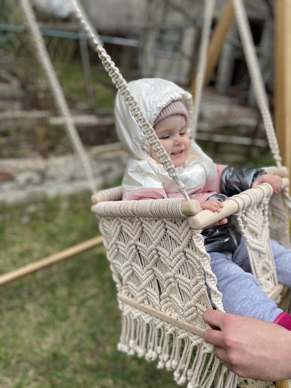 Дитяча гойдалка в техніці макраме. Це не тільки радість для будь-якої дитини, але й стильний елемент в інтер'єрі або на природі Гойдалка надійно кріпиться на металевих карабінах. Довжина підвісних робиться індивідуально, виходячи з ваших побажань Посадкове місце виготовлене з фанери 15мм. Є аргономічні вирізи під ніжки дитини Всі деталі надійно сплетені між собою, забезпечуючи комфортний, веселий та естетично приємний час проведення. Дополнительные характеристики: Пол: Унисекс Возраст : До 3 лет Материал : Дерево Материал : Текстиль Материал : Фанера Материал каркаса: фанера Вид : Качели Товар под заказ