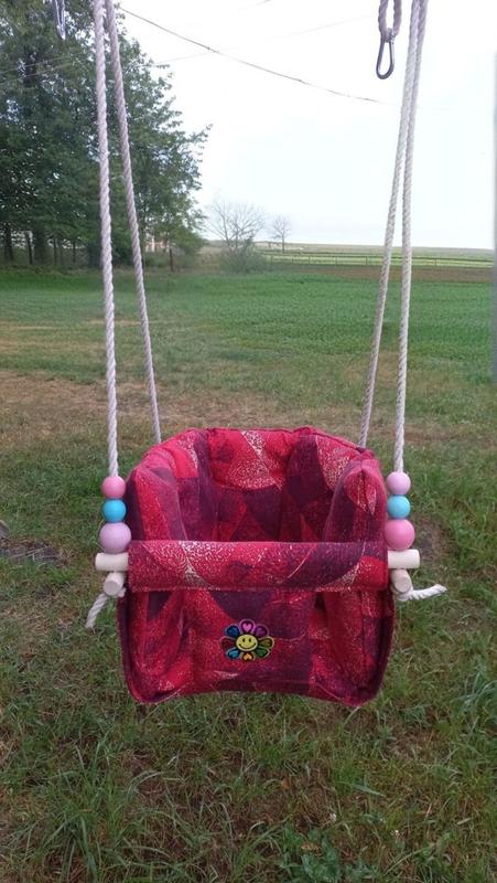Підвісна гойдалка ручної роботи,як для дому так і на вулиці,від 7місяців до 10р..Тканина меблева дуже цупка гіпоалергенна не линяє можно прати розвязавши вузли і витягнути палички. Подушки і матрасик наповнення холофайбер. Канати бавовняні 10мм,міцні витримка до 80кг.По 3 метра на кожній стороні.Гойдалка розрахована до 40 кг.Палички і кульки виготовлені з буку екологічно чистого матеріалу. Розмір гойдалки 40×40×23До канатів ідуть карабіни 2шт,також є пасок беспеки на одну точку