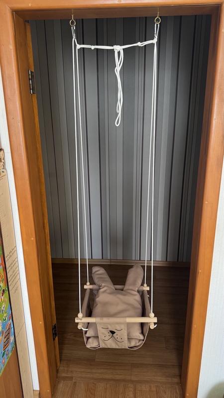 Дитяча підвісна гойдалка. Як для дому, так і для подвір’я. Кріпиться анкер-кріпленнями для бетону, карабінами та шурупами з кільцем. Розміри 40х40х30. Для дітей від 7 місяців. Максимальне навантаження до 80 кг.