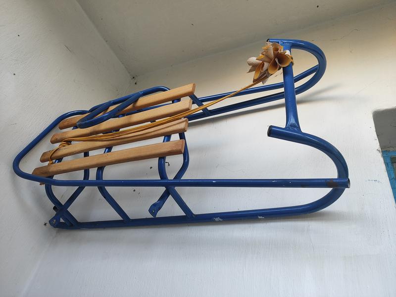 Сани со спинкой и ручкой Есть меховой чехол для сидения Немного стерлась краска А в целом состояние идеален Пользовались редко Ручка и спинка снимаются Самовозиватель