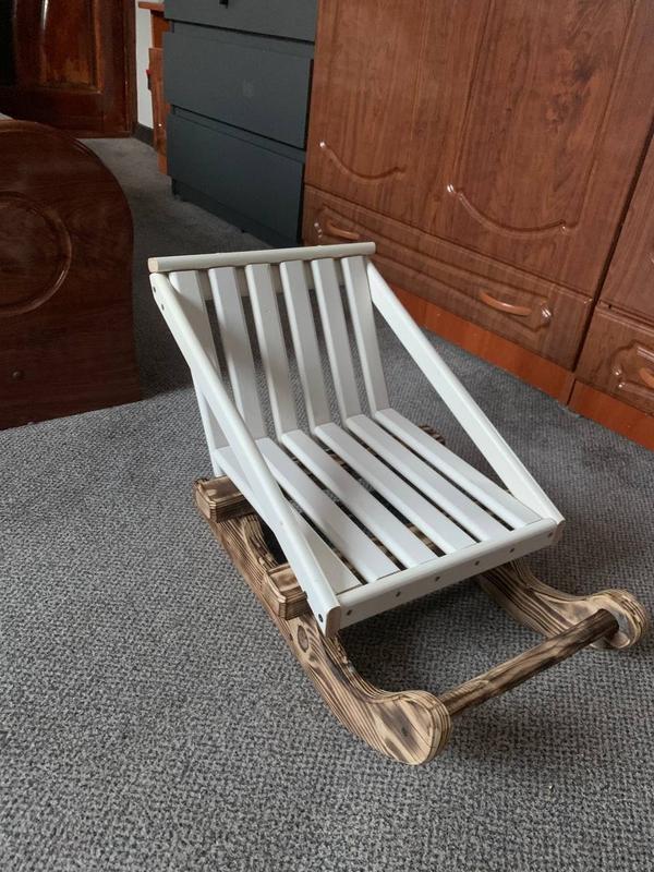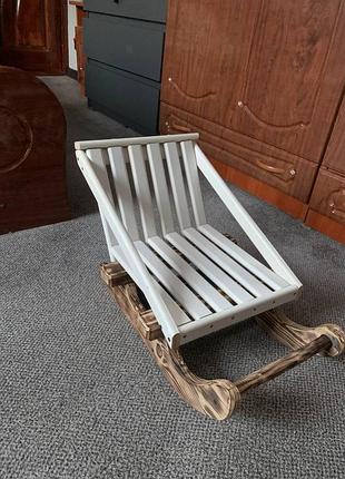 ❄️ Стильні дитячі санки-шезлонг. Незвичайний дизайн, що поєднує біле дерев'яне сидіння та традиційні полози з натурального дерева з випалом. Створіть зимову казку!