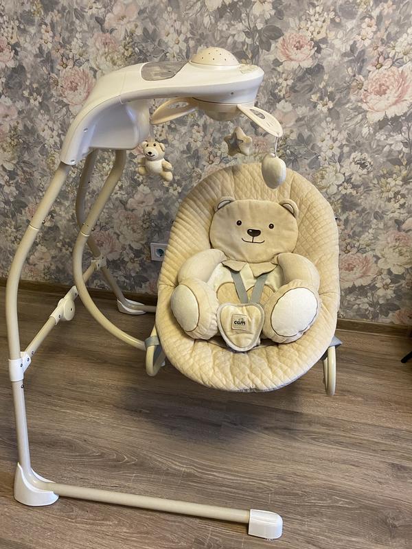 Косло качель шезлонг Cam очень классный и универсальный помощник в хорошем состоянии Закачивающий центр CAM Gironanna предназначен для детей от рождения, весом до 9 кг. Движения укачивающего центра очень мягкие и плавные, словно малыша убаюкает сама мама. Сиденье снимается и может служить креслом-переносом, в котором малыш всегда будет рядом с Вами. Закачивающий центр может работать от батареек и/или от электросети, имеют 4 скорости качания, успокаивающие мелодии и вибрации. Характеристика: Предназначен для детей весом до 9 кг. Сиденье поворачивается вокруг своей оси 4 скорости укачивания Автоматическое отключение (10, 20, 30 минут) 5 успокаивающих колыбельных, 3 мелодии со звуками природы Регулируемая громкость 3 положения спинки Вращающийся мобиль с игрушками Ночник-проектор Мягкий, плюшевый вкладыш 5-ти точечные ремни безопасности Ножки с скользящими резиновыми вставками Тканевый чехол полностью снимается и стирается при температуре 30°С Компактно складывается Блок питания для стандартной электросети 220 В Также, работает от батареек