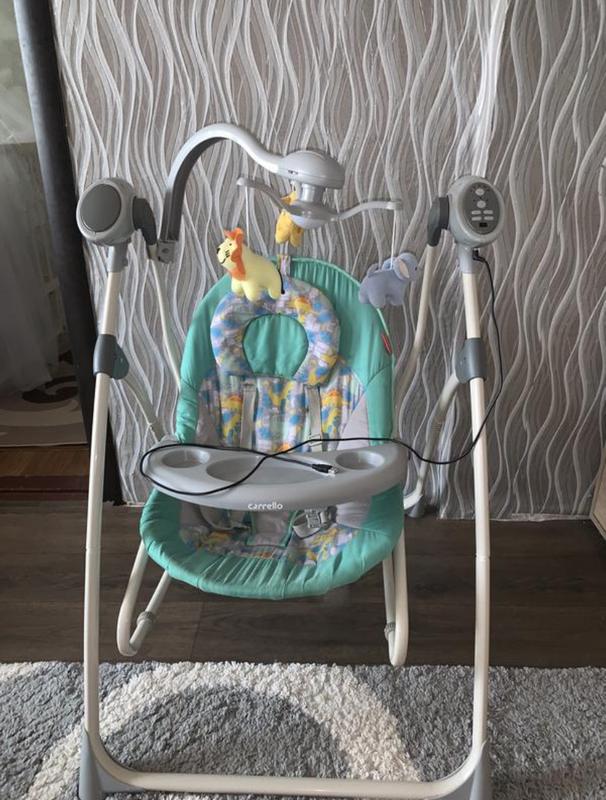 Гойдалка- шезлонг. Фирмы Carello Nanny в отличном состоянии, Подходит и для новорожденных и малышей до 12 кг, 5 скоростей укачивания, таймер, музыка – 12 мелодий с регулировкой громкости, съемный столик. Мобиль с подвесными игрушками, спинка сиденья имеет три позиции наклона.