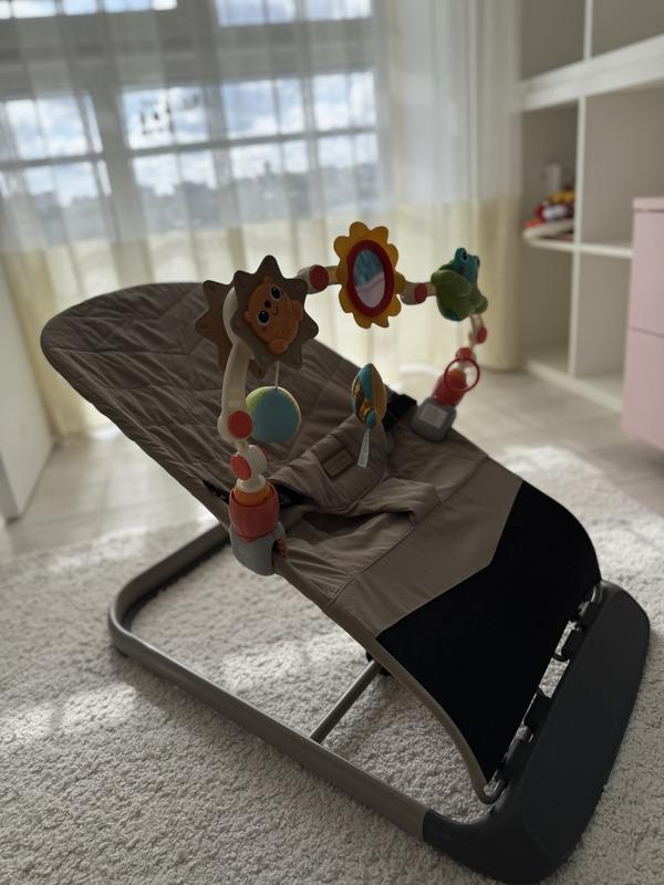 Шезлонг-баунсер з функцією гойдання, має з три положення нахилу. В ідеальному стані по корпусу є одна подряпина, тканина в ідеальному стані. Після однієї дитини. В комплекті дуга з іграшками яку можна також кріпити на автокрісло, каляску чи колиску. Є від нього коробка.