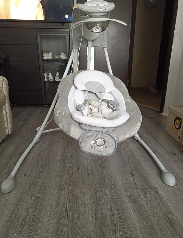В ідеальному стані, без дефектів, використовувалась пару разів, єдине, що немає іграшок, при переїзді загубились, крісло повертається у правий та лівий бік, під ножками є режим вібрації для ніжок, різні швидкості гойдання, ремені безпеки регулюються, є музика, гучність музики регулюється, є таймер, шар крутиться та світиться, підходить для діток від 1-9 місяців, до 9кг, упакована в оригінальну коробку.