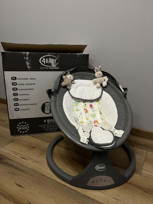 Після однієї дитини, в ідеальному стані. Центр заколисування 4baby Rock'n relax — це електронна гойдалка з народження Вона стимулює розвиток дитини і дозволяє батькам відпочивати. Має 5 швидкостей гойдання з безшумним хитним рухом, 12 вбудованих мелодій з регульованою гучністю, а також USB-порт, який дозволяє грати улюблені колискові вашої дитини. Характеристики: Алюмінієва основа з гумовими накладками Багатофункціональний капюшон USB-порт — можливість відтворювати власну музику Панель управління + пульт дистанційного керування в комплекті М'яке фасонне сидіння зі знімною подушкою У комплекті плюшеві іграшки Легка складна система зі знімним сидінням Електропривод (адаптер живлення в комплекті) або акумуляторна батарея 5-точкові ремені безпеки 5 швидкостей кочення 12 мелодій з регульованим об'ємом Таймер: 3 програми гойдання (8, 15, 30 хв) Легке блокування стаціонарного положення Максимальне навантаження 9 кг Розміри 50/53/73 см Вага: 3,5 кг