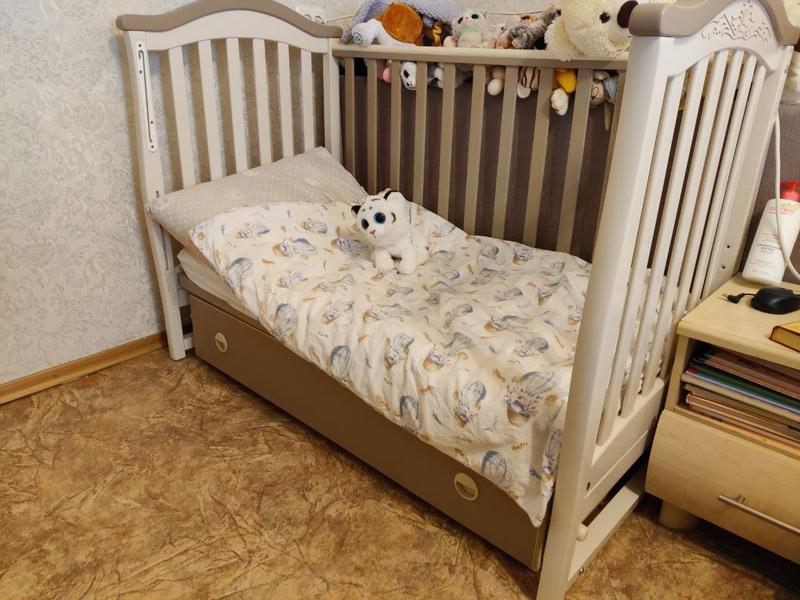 Детская кроватка Верес. цвет комбинированный - капучино+молочный.Высота спального места регулируется и устанавливается в трех положениях. в комплекте выдвижной ящик под кроватью, маятник, новые колесики и добротный кокосовый матрас. окрашенное покрытие имеет несколько сколов, но они в глаза не бросаются и на эксплуатацию не влияют.