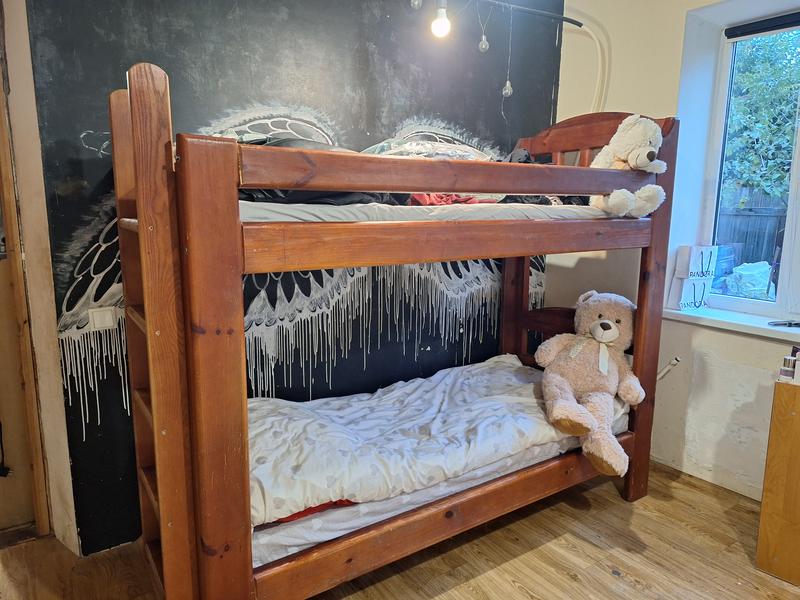 Детская кровать производилась под заказ. Б.у. имеет ламелы на обоих этажах, очень хорошо и качественная кровать. Габариты 88 ×168×197 без учета лески. имеет дополнительные перегородки и поручень. дети выросли и уже хотят отдельные кровати.