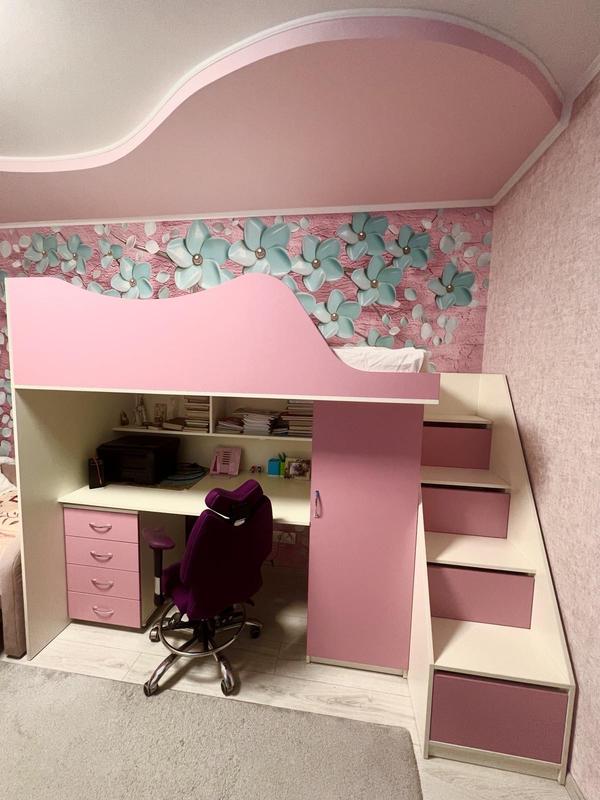 Ліжко-горище з вбудованим столом, шафою та висувними ящиками. Ніжна комбінація білого та рожевого кольорів, що створює затишну атмосферу. Зручні сходинки, які одночасно є висувними ящиками для зберігання речей. Просторий стіл під ліжком з полицями та тумбою з шухлядами. Вбудована шафа та ящики в сходах та під столом забезпечують багато місця для іграшок, одягу та шкільного приладдя. Це ідеальне рішення для невеликих дитячих кімнат, що дозволяє максимально ефективно використовувати простір. Ліжко в чудовому стані та готове до використання.