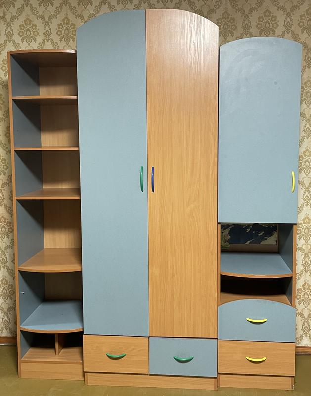 Набор / мебельная стенка «Детская комната» (произведено по заказу) Корпус мебели изготовлен из ламинированной ДСП плиты, фасад – ДСП цветной. Стенка большая и вместительная. Габаритные размеры стенки (ширина/длина 1250 мм, глубина 500 мм, высота 2090 мм + шкаф комбинированная: ширина 450 мм, глубина 500 мм, высота 2060 мм) = 1700 мм, глубина 500 мм, высота 2060 мм. Детская комната состоит нескольких модулей: 1.Шафа для одежды (размеры внутренние: ширина/длина 770 мм, глубина 500 мм, высота 1745 мм) с одним отделением за дверцей имеет верхнюю полочку (высота 250 мм) и штангу для вешалок-плечиков; внизу (с снаружи) имеет два выдвижных ящика для мелкой одежды (ширина 350 мм, глубина 500 мм, высота 118 мм). Шкаф установлен на цоколе. 2.Шафа комбинированная (пристроен модуль в шкаф для одежды ) имеет 6 секций полочек: ширина 420 мм, глубина 500 мм, высота 240/280/280/420/114/200/200 мм. Шкаф установлен на цоколе. 3.Шафа комбинированная (пенал) размеры ширина 450 мм, глубина 500 мм, высота 2060 мм по дверце 4 секции полочек для одежды (размеры внутренние: ширина 420 мм, глубина 450 мм, высота 256 мм - каждой полки) две открытые секции полочек: одна – ширина 440 мм, глубина 450 мм, высота 300 мм; другая – ширина 440 мм, глубина 450 мм, высота 118 мм имеет два выдвижных ящика для мелкой одежды: ширина 380 мм, глубина 500 мм, высота 118 мм. Шкаф установлен на цоколе. 4.Секция антресольная (ширина/длина 1310 мм, глубина 355 мм, высота 330 мм) с обеих сторон полочки с дверцами (размеры внутренние: высота 300 мм длина 420 мм, глубина 355 мм по середине открытая секция (ширина 400, высота 300 мм, глубина 355 мм) Состояние: Б/В, качественная, целая, без повреждений.