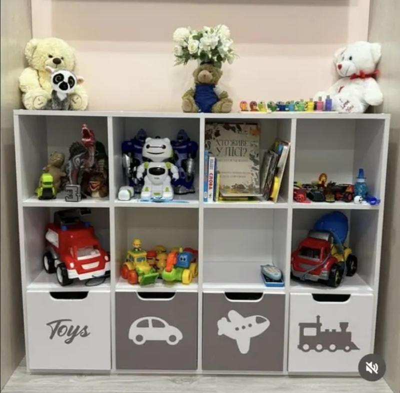 Стеллаж для игрушек, книг, и других детских вещей, изготовленный из высоко-качественного ламинированного ДСП, и покрытый безопасными средствами. Стеллаж имеет 12 ячеек и не имеет острых углов. Вся наша продукция сертифицирована и вполне безопасна для ребенка. Стеллаж выполнен в разных цветах, и имеет много вариантов рисунков. Размер стеллажа: Высота 97 см Ширина 128 см Глубина 30 см Вес 50 кг Материал каркаса - ЛДСП 16 см. Задняя стенка - ХДФ. Открытка по Новой почте. Стеллаж отправляется в разобранном виде, то есть в виде посылки.