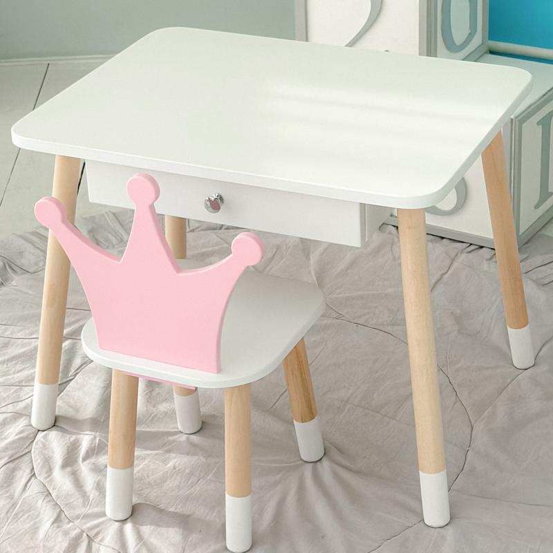 Детский столик белый и стульчик корона бело-розовый. Столик с выдвижным ящиком для карандашей и раскрасок 56787 Характеристики: Стол с ящиком: - Размер (ВхДхШ): 46х60х45 см - Материал: Натуральное дерево и МДФ - Глибина ящика: 6 см - Ширина ящика: 34 см - Длина ящика: 30 см - Фарба: Екофарба. Не вызывает аллергии у деток - Выдвижной механизм ящика Стульчик размеры: Размер (ВхДхШ): 26.5х26х25 см Материал: Натуральное дерево и МДФ Краска: Эко краска. Не вызывает аллергии у деток Особенности нашей мебели: 1. Интересный дизайн 2. Простая сборка 3. Надежная и удобная в использовании конструкция 4. Подходит для обучения и игр Изготовлен в соответствии с гостой для детей 1 группы роста (100-115 см) ⠀ Подходит для детей от 1,5 до 7 лет. Выдвижной ящек для хранения вещей ⠀