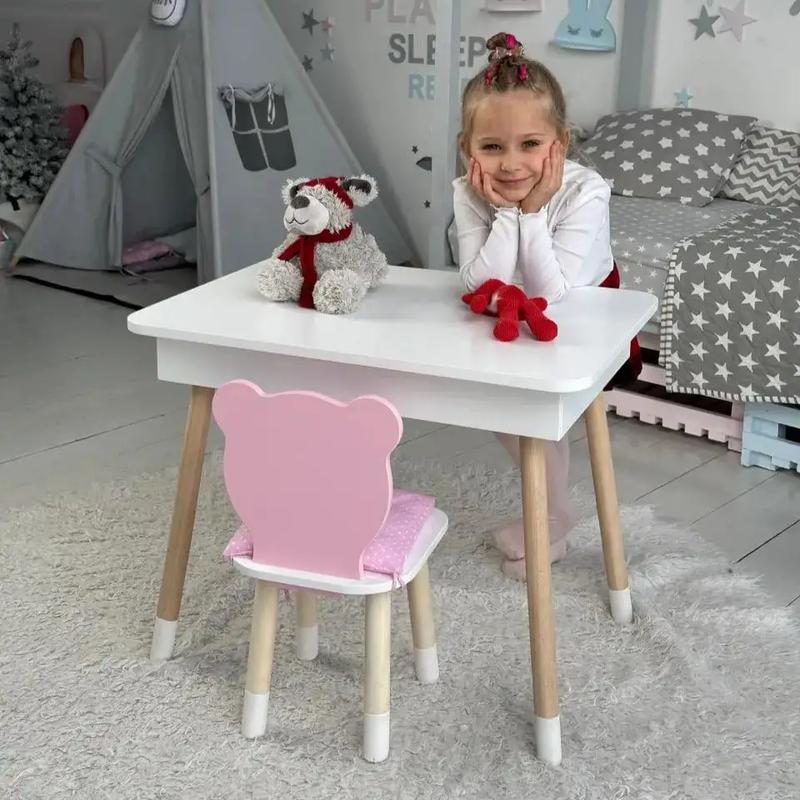 Детский столик с ящиком для карандашей и стульчик мишка белый с розовым для девочек для ри...