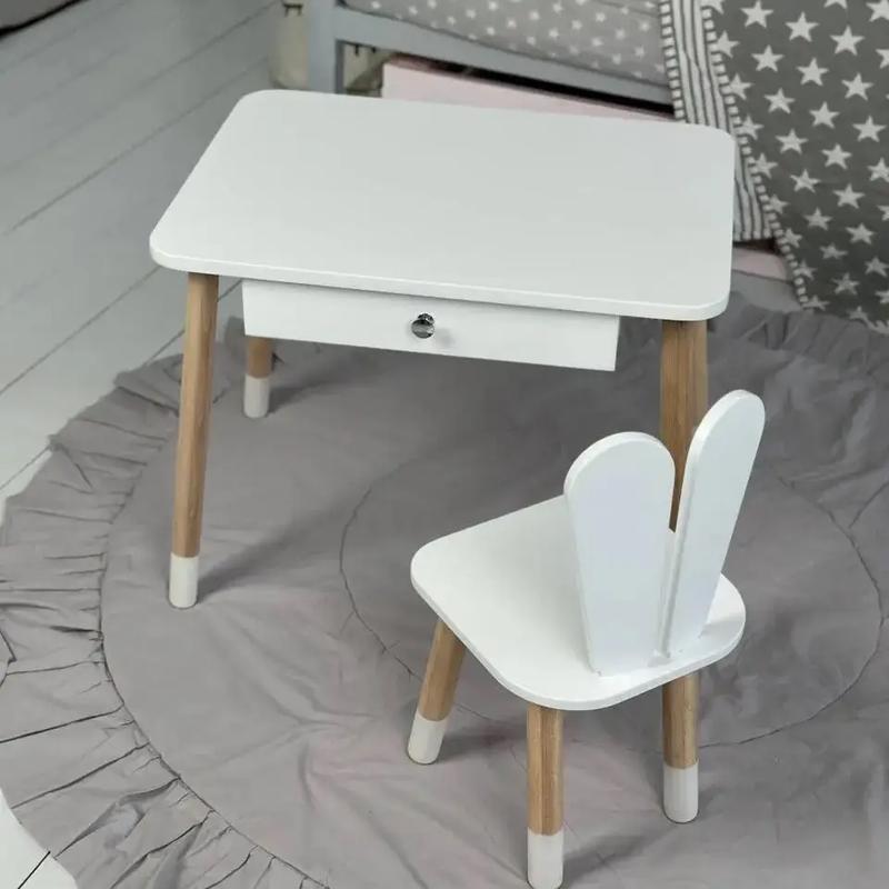 Детский столик со стульчиком зайчик белый для рисования и игр с ящиком для хранения каранд...