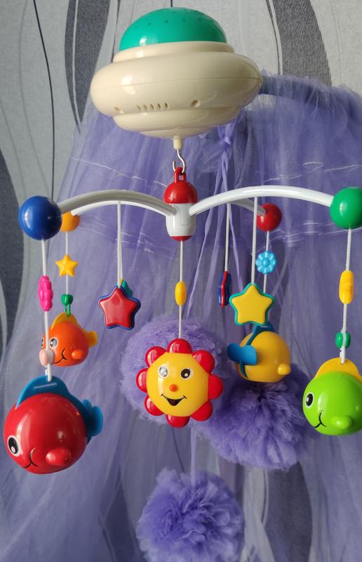 Функції: музика (регулюється гучність) світло проектора (зелений та синій) В комплекті: музичний блок з проектором підвіски 5 шт підніжка Пісні українською мовою Дуже гарні, дитині сподобається Є коробок Можно навіть на подарунок, адже стан ідеальний