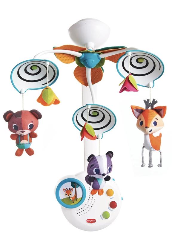 Мобиль "Лесные друзья" Мобиль познакомит ребенка с тремя новыми друзьями: медвежонком, оленем и бобром. Такая веселая компания развлечет малыша днем и успокоит удивительной музыкой с мягким светом ночью. Общая продолжительность мелодий - 30 минут. Существует три вида музыки: классическая, звуки природы и колыбельная.