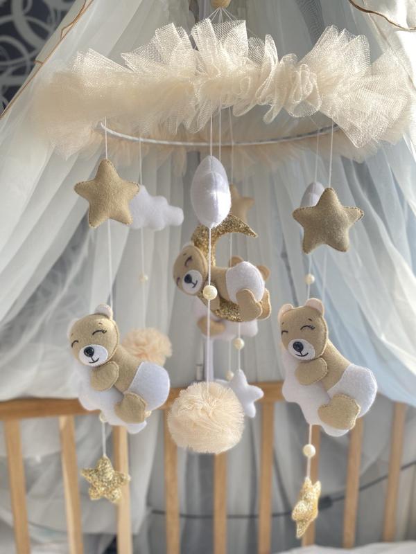 Цена указана только за кольцо с игрушками!.⚠️ Можно приобрести отдельно основание с игрушками или дополнить ее комплектующими – музыкальный блок, который будет вращать игрушки и воспроизводить приятные мелодии, кронштейн пластик/дерево на выбор. Если в кроватке будет балдахин, то кронштейн не нужен. Мобиль в таком случае можно закрепить на держателе балдахина ☝️ Будь-мобиль можно повторить или скорректировать по цвету и игрушкам! Также можно разработать мобиль с героями по любым иллюстрациям🤗 Подберем палитру и дизайн мобиля в концепции с бортиками в кроватку и общим интерьером комнаты👌