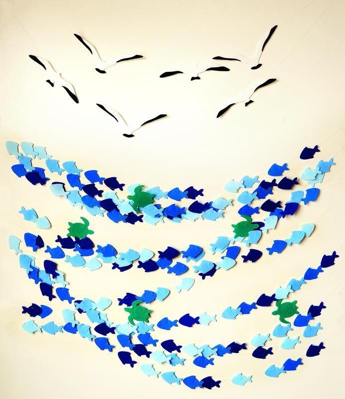 Морская гирлянда для декора детской комнаты, для фотозоны, для фотосессии, для морской вечеринки, для аппликаций. Каждая рыбка имеет длину около 5 см, черепаха 6 см, чайка 16 см. В комплекте 6 гирлянд: чайки, черепахи и 4 гирлянды с рыбками. Рекомендую монтировать и демонтировать по очереди, чтобы не запутаться. Длина каждой гирлянды 2-3 м. Гирлянды собрана на прозрачную леску, поэтому фигурки можно двигать и регулировать по длине. Детали вырезаны из прочного корейского фетра толщиной 1,2 мм. Возможно исполнение в других цветах, можно дополнить буквами или цифрами. Дополнительные характеристики: Материал : Фетр