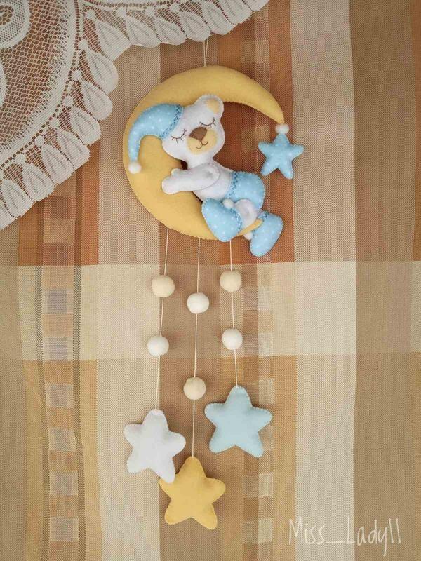 Милая подвеска прекрасно подойдёт для детской комнаты. Размер: Мишка на луне - 17 см х 16 см Высота подвески (без петельки) – 40 см Подвеска изготовлена из фетра (китайский, корейский). Наполнитель – синтепон. Возможно изготовление в другом цвете на заказ. Дополнительные характеристики: Материал : Фетр