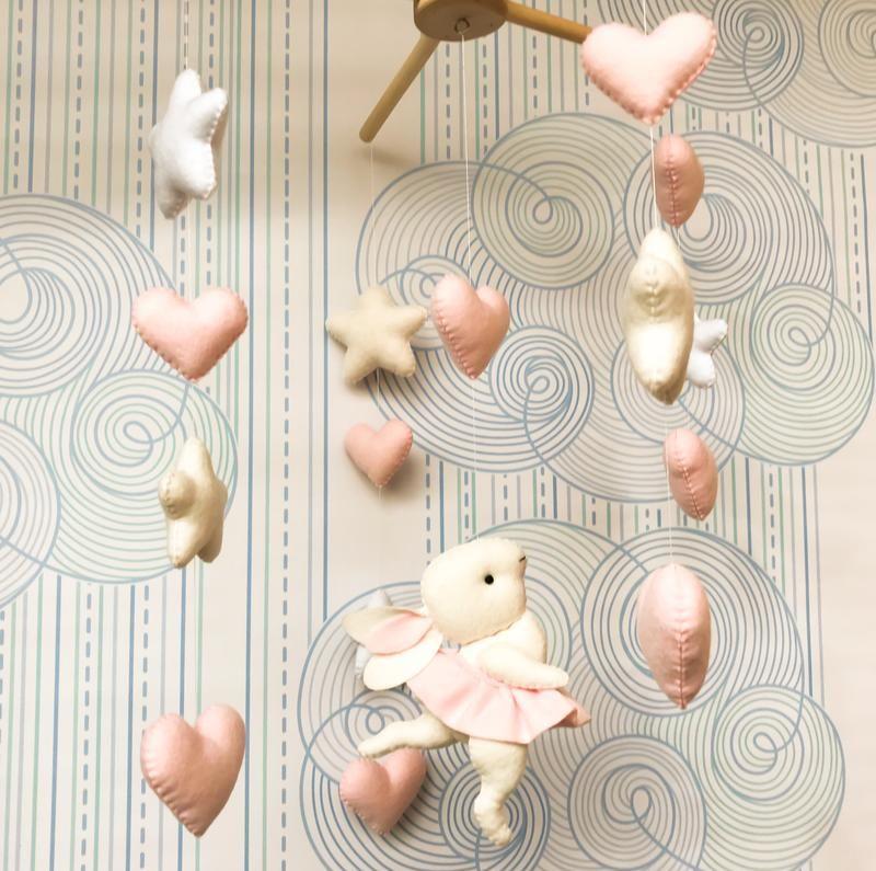 Дополнительные характеристики: Пол: Для девочек Материал : Фетр Цвет: Белый Цвет: Розовый Возрастная группа: С рождения Тип: Мобиль для кроватки Товар под заказ