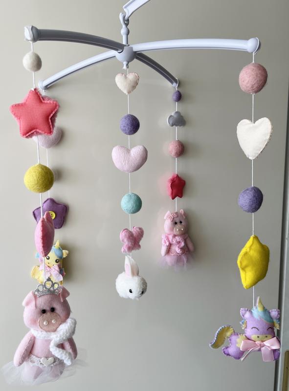 Мобіль ручної роботи з фетру . Мобіль стане не тільки окрасою ліжечка малюка, але і розвиваючою іграшкою, з якою дитина буде швидше засипати і пізнавати яскравий навколишній світ. Мобілі допомагають малюку навчитися концентрувати увагу на певному об'єкті, відстежувати рухомі об'єкти, а яскраві фарби позитивно позначаються на розвитку малюка. Ціна вказана за хрестовину з іграшками, музичний блок і тримач можна придбати додатково.