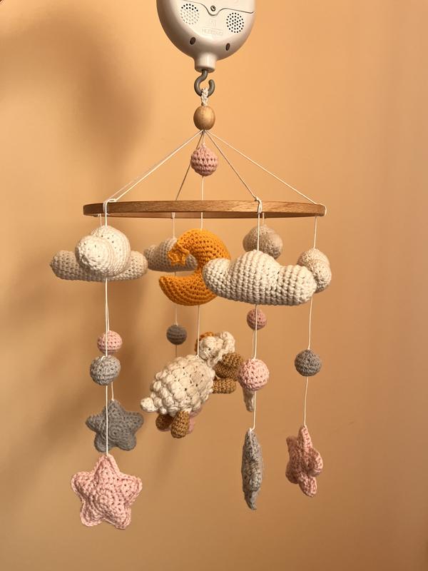 Мобіль ,Спляча овечкаʼʼ.Мобіль для немовляти .Хмаринки,зірочки,спляча овечка повна гармонія у всій красі. Бавовняні нитки,наповнення холофайбер.Діаметр кільця 22см. Мобіль приїде до вас у подарунковій коробочці. Додаткові характеристики: Стать: Для дівчаток Матеріал: Пряжа Колір: Рожевий Вікова група: З народження Особливості: Мелодії Тип: Мобіль для ліжечка Товар виготовляється на замовлення