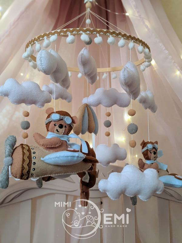 Продам новый мобиль собственного производства. *Кумажные мишки, самолетики и парашютик. Нежные цвета и приятная мелодия. *Музичный мобиль ручной работы станет отличным подарком для малышей и идеально впишется в детский интерьер. *Окремо можно приобрести муз.блок и держатель к кроватке