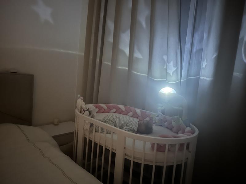 Три приємних підвісних ведмедики-метелики крутяться по колу, привертаючи увагу маляти, а 30 хвилин колискових мелодій і звуків природи заспокоюють дитину та сприяють її швидкому засипанню. Мобіль можна приєднувати до ліжечка, підвіска з ведмедиками кріпиться до коляски, а купол мобіля можна використовувати окремо як проектор-нічник. Вмикаючи та вимикаючи мобіль можна за допомогою пульта дистанційного керування.