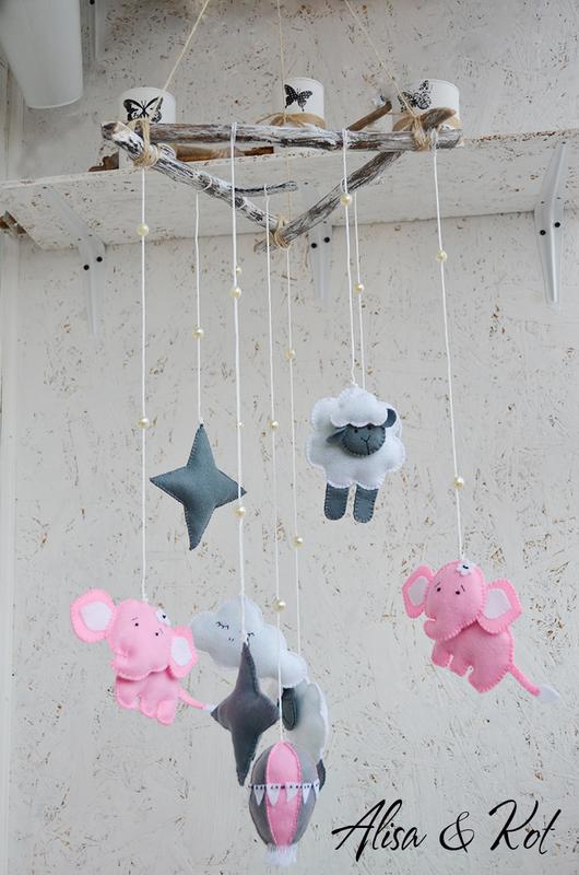 Без приводу. Размер: - Игрушки 13х10см. - Длина всей конструкции от палочек-основы до нижней игрушки - 65см. - Палочки основа каждая – 33см. – Верхние нити регулируются. Мобиль для детской комнаты в нежных серо-розовых тонах из 8-ми игрушках – это идеальный подарок для маленькой крохи. Яркие цвета игрушек мобиля сделают сказочной любую детскую кроватку, они положительно влияют на глаза и настроение ребенка. Игрушки для детского мобиля в кроватку пошиты из качественных материалов - полушерстяной фетр обладает антибактериальными и гипоаллергенными свойствами, гипоаллергенным является и холлофайбер, используемый для набивки. Основа мобиля сделана из настоящих веток каштана.
