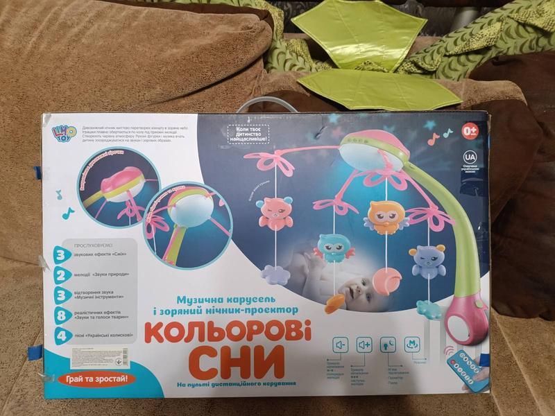 Карусель музыкальная от ТМ TK Group В свою конструкцию мобиль включает: - Режим ночного освещения; - крепления; - проектор звезд; - панель управления; - Яркие игрушки зверя; - пульт ДУ. Проектор обладнаний 4-ма сенсорними кнопками: - Громкость +; - Громкость -; - вкл/выкл света проектора; - Изменение мелодий. Также мобиль работает от дистанционного пульта: - вкл/выкл мобиль; - вкл/выкл свет проектора; - перемотать мелодию вперед; - перемотать мелодию обратно; - Переключить детский смех; - мелодии; - звуки природы; Звуки тварин; - колыбельные; - таймер на 10/20/30 мин; - Громкость + - Громкость -. Музыкальная панель насчитывает около 20-ти мелодий, песен, колыбельных и звуков: - 3 вида смеха; - 2 вида природы; - 3 звука музыкальных инструментов; - 8 звуков животных; - колыбельные.