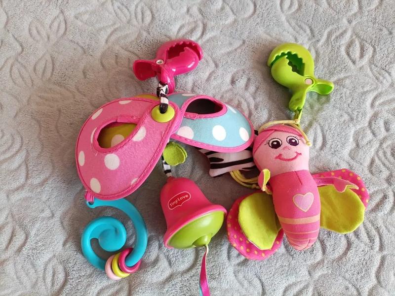 Продам две подвески в коляску Tiny love. В отличном состоянии. Одна с колокольчиком, погремушками и зеркальцем. Вторая - бабочка, шуршат крылышки, жужжит (механический моторчик, нужно потянуть бабочку вниз).