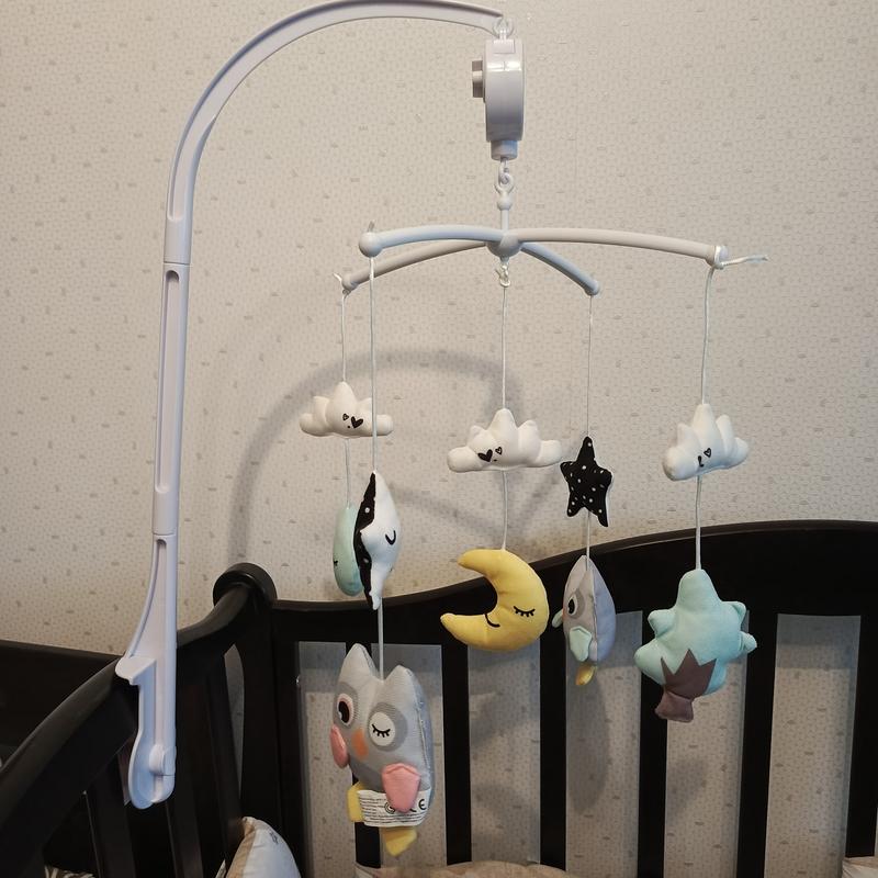 Музыкальный мобиль на кроватку. Фигурки мягкие, чистые, очень красивые. Мелодия работает идеально, крепеж прочный. Состояние отлично — пользовались аккуратно.