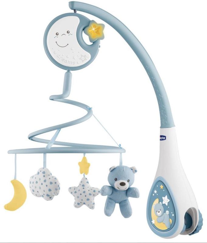 Особливості: 20 хвилин музичного супроводу — класична музика (Шопен, Шуман, Оффенбах) і білий шум (серцебиття й інші звуки, які сприймаються дитиною всередині маминого животика); 4 знімні іграшки-підвіски з гіпоалергенного текстилю обертаються під ритми музики; м'яке нічне світло створює спокійній та затишні умови в дитячій кімнаті; мобіль пасує для колиски Next2Me та інших ліжечок із діаметром стінки до 38 мм; знімну електронну панель можна прикріпити як на бортик ліжечка, так і до коляски.