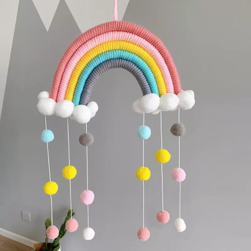Підвісна райдужна прикраса ручної роботи з бавовняно-паперової мотузки з фетровими кульками. Використовується для декору дитячої кімнати. Стиль, колір можна коригувати під інтер'єр вашої дитячої/спальні. ширина 26 см. висота 50 см.