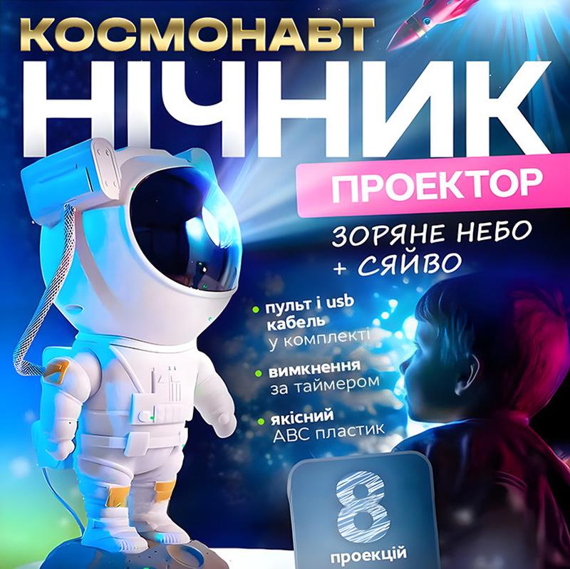 ННочник проектор Астронавт звездного неба Космонавт 8 режимов Астронавт Лазерный светильник с пультом SP-19 Остерегайтесь подделок и проекторов низкого качества их сейчас очень много под видом Lux качества! Мы предлагаем самое высокое качество среди Ночников проекторов Космонавт на рынке Украины. 🌌👨🚀✨ Ночник-проектор "Звездное небо: Космонавт" 🌌👨🚀✨ Отличный выбор для детской комнаты, создающий атмосферу звездной Галактики. 👨🚀🎥🌌 Проектор в форме космонавта демонстрирует проекцию звездного неба и всей Галактики. 👨🚀💡🔄 Голова космонавта на магнитах - её можно поворачивать и регулировать руки. Фигурка стоит на базовой основе, имитирующей лунную поверхность. 🌟🔦 Звездный проектор обеспечивает удивительные визуальные и световые эффекты. Идеально подходит как ночник для детей, гаджет для вечеринки или повседневное освещение для гостиной, создающее романтическую атмосферу. Особенности: - 🌌🌠 Проекция звездного неба и галактик (возможно отключение одного или другого) - 🔄👨🚀 Регулировка головы на 360° - 8️⃣🎥 Восемь видов проекции (различные туманности) - ⏰🔌 Встроенный таймер выключения на 45 или 90 минут - 💡🌟 Регулировка яркости туманности и звезд - 🔄🔒 Регулировка скорости вращения туманности или отключение вращения - 🕹️🎛️ Пульт для удобной удаленной настройки в комплекте - 🌕🔦 Подставка-имитация луны Характеристики: - 🔌Мощность: 5️⃣W - 📡Дальность действия: 2️⃣-1️⃣0️⃣m - 🛠️Материал корпуса: ABS пластик - 🔌Питание: USB - ⚡Напряжение: 5️⃣V 1️⃣A - 📡Диапазон действия пульта: 5️⃣m - 🌈Длина волны лазера: 532NM - 📏Размеры: 9️⃣ x 1️⃣1️⃣.3️⃣ x 2️⃣0️⃣.8️⃣сm - 🔌Длина шнура питания: 1️⃣.5️⃣m Комплектация: - 👨🚀🎥 Проектор "Космонавт" - 🎮 Пульт управления - 🔗 USB кабель - 📖 Инструкция - Этот милый и забавный ночник станет настоящей изюминкой интерьера! - ДОСТАВКА ПО всей УКРАИНЕ: Мы качественно и надежно упаковываем все наши посылки, за сохранение содержимого можете не беспокоиться. Но все же просим проверять посылку на предмет повреждений непосредственно в отделении службы доставки, и в случае обнаружения повреждений составлять соответствующий акт с сотрудником службы доставки. Без акта о повреждении претензии не принимаются. Это редкие случаи, но при пересылке хрупких предметов иногда происходят. Поэтому во избежание недоразумений просим проверять содержимое посылки при получении. Смотрите наши другие объявления. Всем удачных покупок.