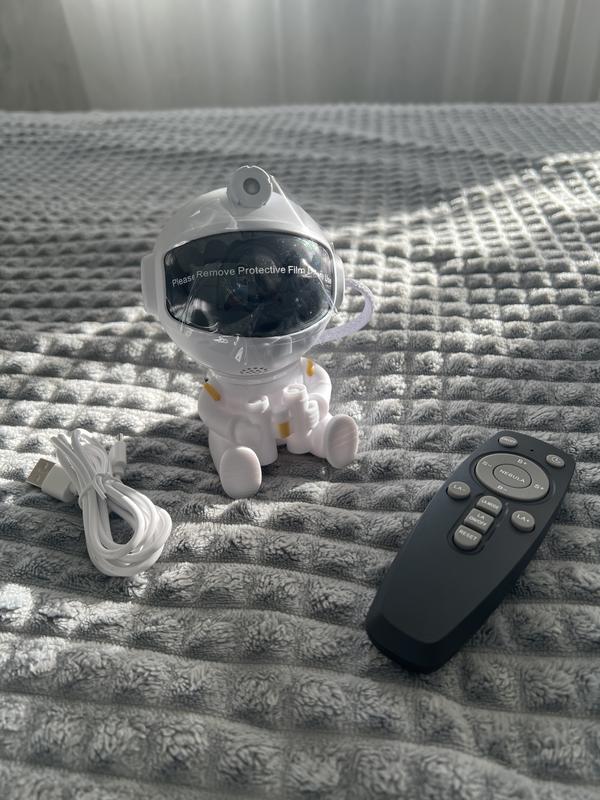 Новий нічник-проектор у вигляді астронавта. Створює ефект зоряного неба на стінах і стелі. Комплектується пультом дистанційного керування для зручного регулювання яскравості та кольору підсвічування. Трохи деформована коробка видно на останньому фото.