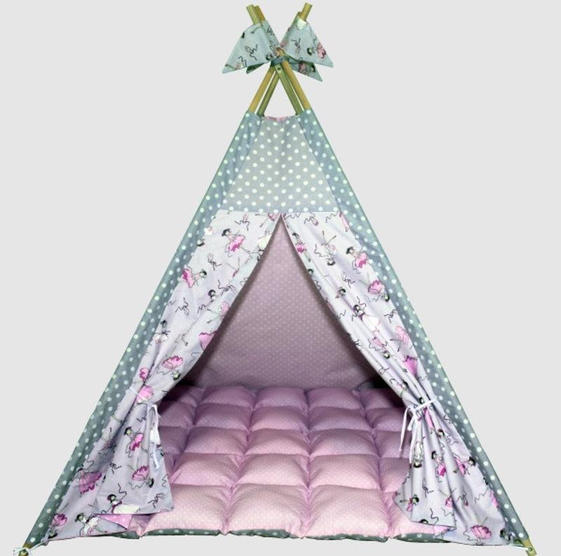 Игровой шалаш, палатка, вигвам с ковриком. Размер 100*100 см высота 110 см Балерины ## Дети просто обожают играться в шалашах, прятаться и просто проводить время в уютном месте. Очень важно, чтоб эта часть игровой зоны была безопасной и надежной. У нас Вы можете найти прекрасный детский вигвам, который порадует и Вас и Вашего ребенка. Исполните мечту ребенка и подарите ему личное местечко для времяпровождения. Маленький домик уж точно не останется без дела. Современная игрушка даст малышу чувство защищенности и спокойствия. Такая индейская палатка подойдет даже для самых маленьких. В комплект входит: Вигвам с окошком; Деревянный каркас; Инструкция по сборке; Чехол для каркаса; Коврик. Вигвам выполнен из 100% хлопка, полностью безопасен для Вашего ребенка. Деревянный сборной (каждая стойка состоит из двух половинок), или цельный каркас тщательно отшлифован, не подвергается химической и лако-красочной обработке. Благодаря отсутствию острых углов безопасен для ребенка, не повредит напольное покрытие.