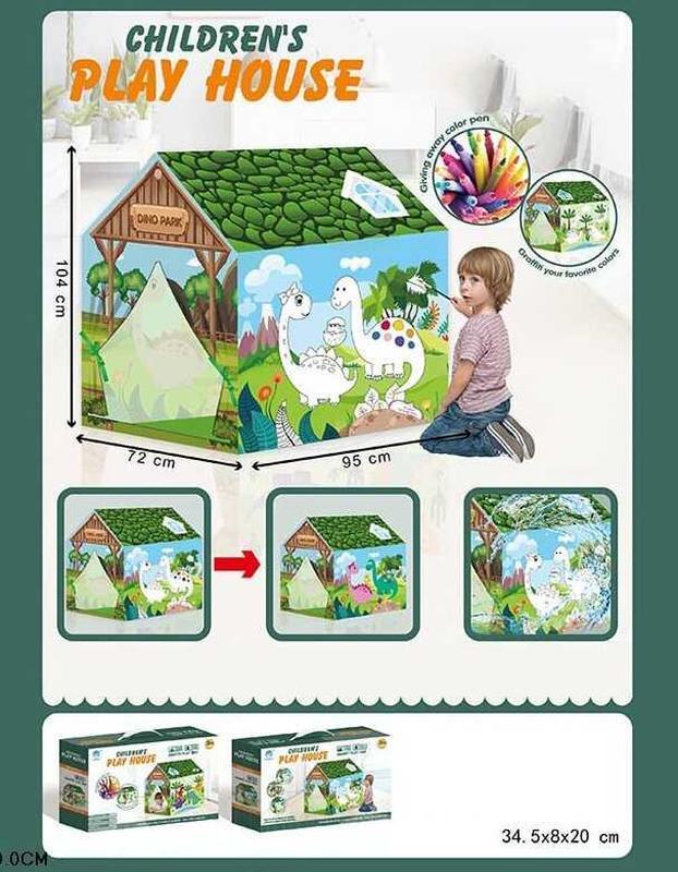 Создайте магию в детской комнате с палаткой "Дино парк"! Палатки становятся замечательным дополнением к детскому пространству, и наша палатка "Дино парк" - не исключение! Эта яркая палатка выглядит как маленький домик, наполненный цветными рисунками и веселыми динозаврами, которые непременно привлекут внимание ваших детей. - Одна из стен палатки выполнена в виде раскраски, что дает детям возможность проявить свою творческую натуру, заполняя рисунки яркими цветами. - В комплект входят 12 цветных фломастеров, что делает игру еще более захватывающей. - Легкая и быстрая сборка конструкции позволяет детям быстро создать свое собственное пространство для игр. - Шторки на завязках добавляют элемент интерактивности и уюта, делая палатку идеальным местом для скрытых игр. - Устойчивая конструкция из износостойкого материала обеспечивает длительную эксплуатацию, а компактные размеры (95х70х104 см) позволяют легко размещать ее в любом уголке комнаты. - Легкое очищение с помощью влажной губки делает уход за палаткой простым заданием.
