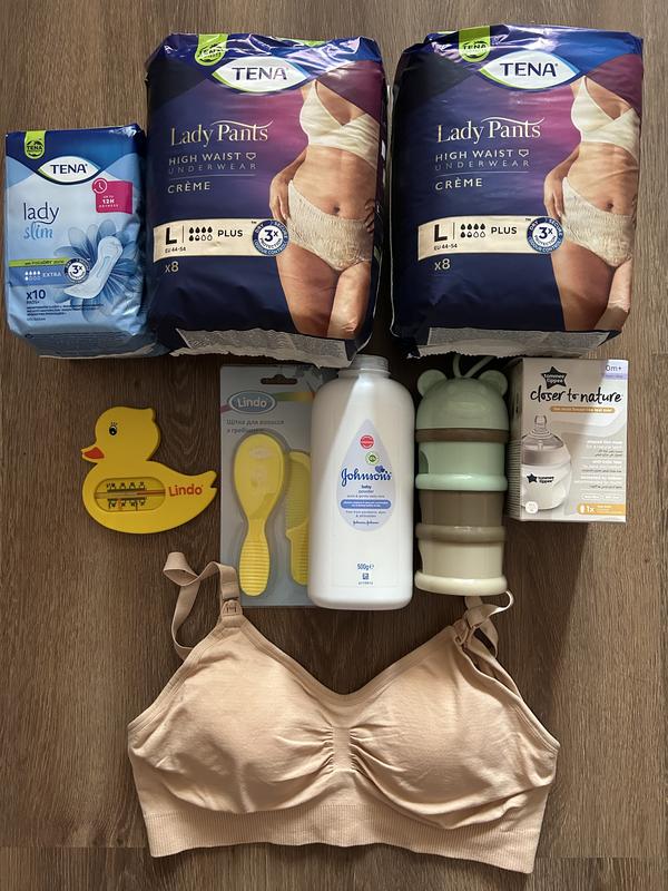 Ціна за набір 1700 грн Запаковані трусики TENA - 2 упаковки розмір Л , урологічні прокладки- 1 упаковка Нові бюстгальтери для годування бежевий та чорний 90-95 розмір Нова пляшечка антиколік , запакована Запакована присипка Термометр та набір гребінців стан нового До замовлення додам памперси поштучно, одноразові накладки для грудей та одяг