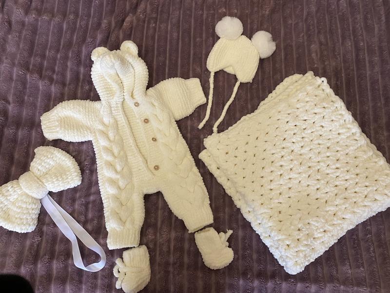 Конверт на виписку для новонароджених ручної роботи . До комплекту входить чоловічок/комбінезончик , плед , шапочка , черевички та бантик ,стан нового