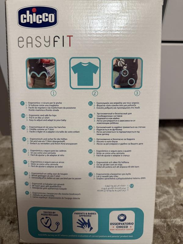 Нагрудна ергономічна сумка EasyFit - проста та інтуїтивна, природна як мамині обійми. EasyFit -легко одягати, регулювати, змінювати положення та переносити малюка з народження до 9 кг. Ергономічна форма, безпечна для кульшового суглоба малюка. Міжнародний інститут дисплазії кульшового суглоба (InternationalHipDysplasiaInstitute ― IHDI) визнав нагрудну сумку Chicco EasyFit безпечною при використанні відповідно до інструкції з експлуатації*. У широкому сидінні дитина знаходиться в М-позиції, яка забезпечує правильне положення для кульшового суглоба дитини - коліна вище сідниць, ніжки широко розсунуті і охоплюють торс батька. Легко вдягати, просто регулювати. Сумку EasyFit так само легко вдягати, як футболку – просто, інтуїтивно та звично. Завдяки простому, швидкому та дуже зручному механізму регулювання, Easy Fit чудово адаптується під малюка та батьків, враховуючи індивідуальні фізіологічні особливості. 2 положення перенесення дитини: "Обличчям до мами" - становище чудово підходить з народження, для тісного контакту малюка з батьками. "Обличчям вперед" - можна переносити дитину з 6 місяців, коли формування тазостегнового суглоба завершено. Маля буде відкривати дивовижний і прекрасний світ разом з вами. Швидко скласти – легко зберігати. Коли ви не використовуєте перенесення, її можна скласти і помістити в кошик коляски або в сумку, щоб вона завжди була під рукою.