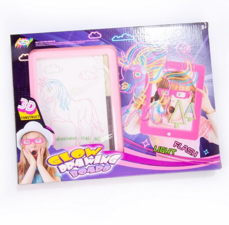 Розміри: 36 см×4 см×27 см На дошці можна сміливо малювати навіть при вимкненому світлі. Шаблони малюнків допоможуть побачити об'ємні фігури відразу, як одягнете 3D окуляри. Малюйте з друзями або поодинці, створюйте прості малюнки або моделюйте 3D об'єкти. Дошка дозволить втілити в життя і побачити на власні очі будь-які лінії, форми та об'єкти зовсім під іншим кутом, за допомогою світла та окулярів! 1 кнопка – активує роботу світлодіодних лампочок. Особливості моделі: - 4 світлодіодні лампочки світяться білим кольором; - рамка для фіксації трафарету; - підставки; - Знімні присоски. У комплект YM 177 входить: - Планшет; - Трафарети; - окуляри; - 4 фломастери; - ганчірочка; - основна панель (працює від 3х батарейок 1.5 V «ААА»)