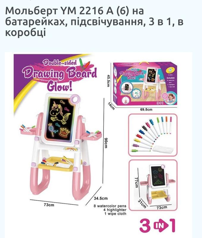 Детский двусторонний Мольберт-планшет 3в1 с разноцветной подсветкой на батарейках. Имеет две стороны черная и белая доска. Этот волшебный мольберт откроет настоящий мир творчества для маленьких художников, имеет легко сборную конструкцию. Удобная полочка для размещения игровых элементов обеспечит порядок в творческом пространстве. Особенности: - легко сборная конструкция; -двусторонняя доска имеет магнитную сторону по которой можно рисовать маркерами, а также черную доску для мела с подсветкой; -двухсторонняя Черная и Белая доска; - в комплекте идут 4 фломастера, губка и 8 маркеров на водной основе - удобная полка для размещения игровых элементов; - основа-планшет имеет яркую разноцветную подсветку и работает от батареек типа “АА” (не прилагаются); -доска вращается на 360°. Размеры мольберта: Высота 90 см Ширина 73 см Длина 34.5 см Размеры упаковки: Высота 45.5 см Ширина 69.5 см Длина 14 см Просто идеальный подарок. Возможна продажа оптом от пяти единиц.