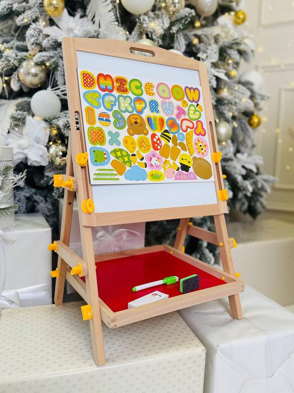 Дитяча дошка знань - дерев’яний магнітний мольберт для малювання та навчання Двостороння універсальна модель відрізняється стійкою конструкцією розробленою з екологічно чистої деревини абсолютно безпечною для дитячого здоров'я Якщо Ваш малюк тільки готується до вступу до школи чи дитячого садка то таке придбання йому обов'язково сподобається Комплектація: Мольберт двосторонній Маркер Кольорова Крейда Губка Магніти Розмір у зібраному вигляді: 65х35х31см Розмір області для письма: 32х29см Розмір упаковки: 45х39х5см