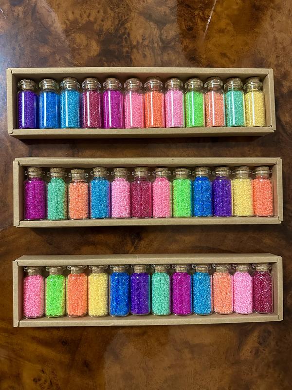 Набор бисера для изготовления украшений и вышивки. Набор состоит из 12 цветов в стеклянных бутылочках. В каждой бутылочке по 15 г бисера. Размер упаковки 27-6,5-2,5 см